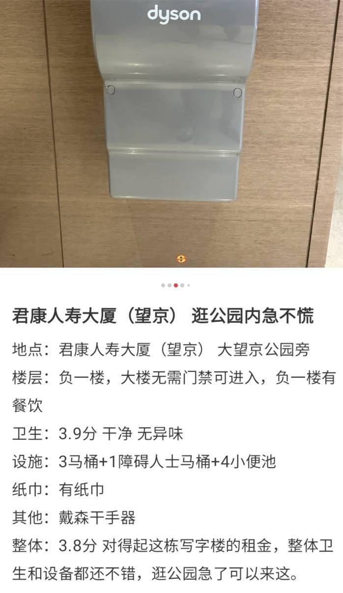 去年,他发布了一条关于北京君康人寿大厦卫生间的详尽测评。不久后,一位家长私信感谢他,说自己带孩子逛大望京公园时,一时找不到厕所,无奈之下只好上社交平台求助,结果恰好搜到了伍凌的厕评文章。按照文章中提供的详细指引,她最终顺利地在公园附近找到了一个干净且整洁的公共厕所。